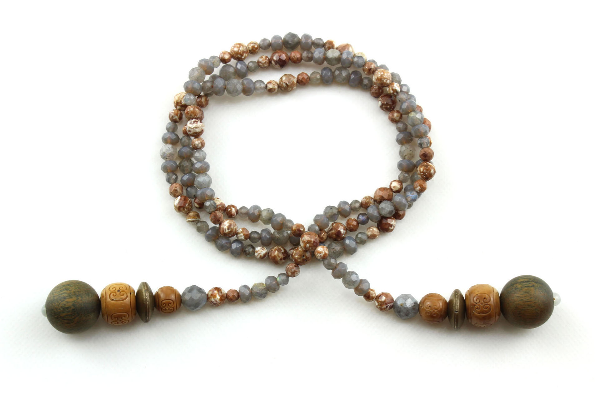 Le collier lariat en pierre de Labradorite & de Mica, un désert balayé par le vent, des teintes d’ocre et de cendre, la pierre sculptée par le temps… Ce drapé est né dans l’écho de ces paysages. Au moment du tissage, j’ai senti ce souffle, cette lente érosion qui façonne et révèle, comme le font les éléments sur la roche nue.