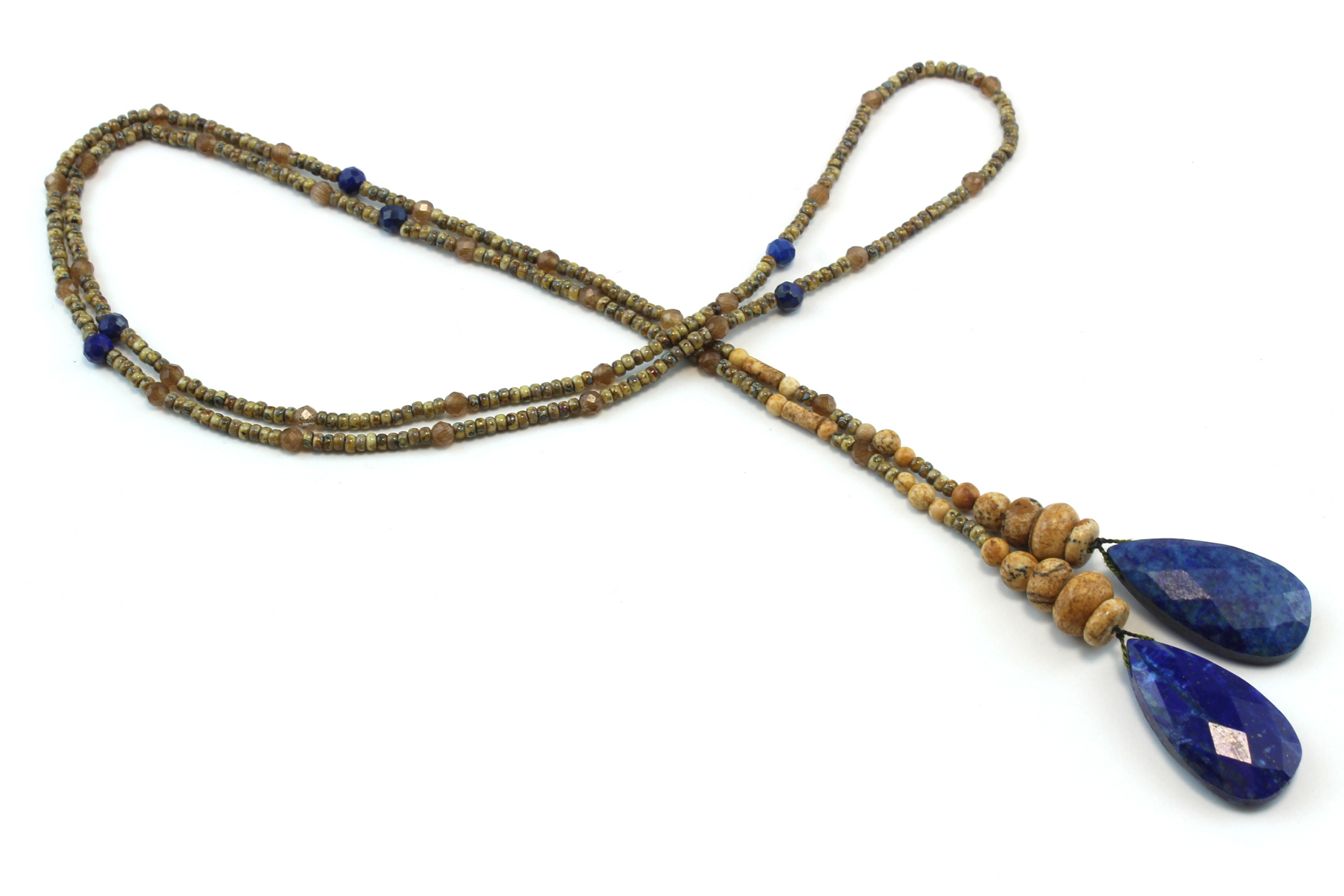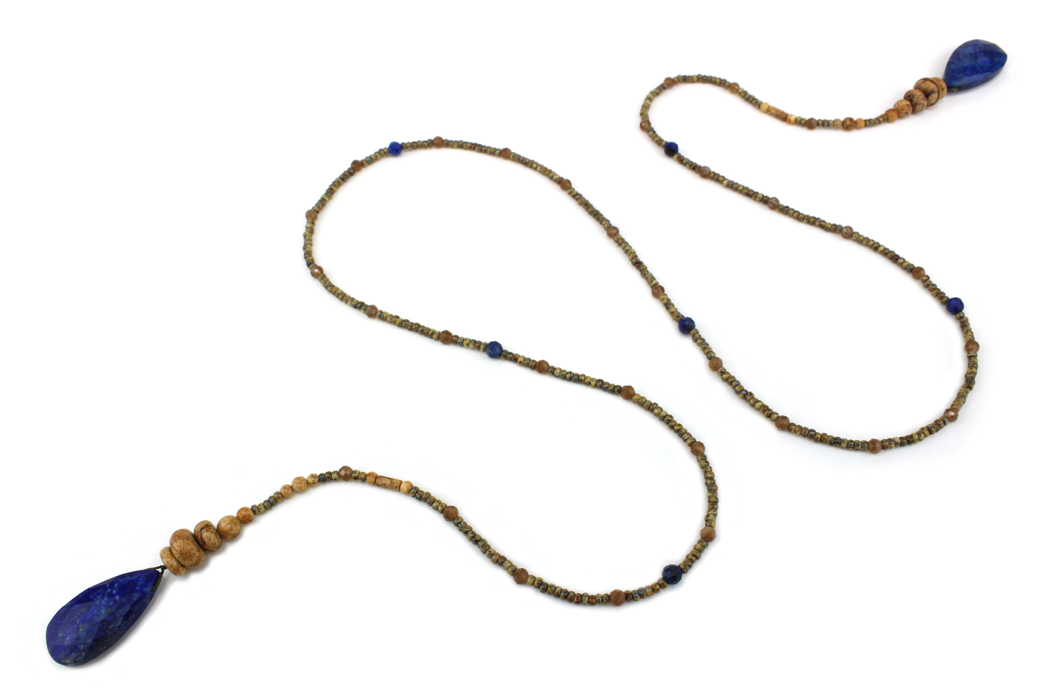 Ses pendants en Lapis Lazuli, profonds et vibrants, évoquent les reflets d’une eau paisible sous un ciel clair. Ils contrastent avec la douceur organique des perles de Jaspe, aux tons terreux et boisés, rappelant les branches nues et les sentiers tapissés de feuilles. Des éclats de cristal marron clair et de perles de verre vertes marbrés viennent illuminer l’ensemble, jouant avec la lumière comme les premiers rayons du soleil sur une matinée d’hiver.