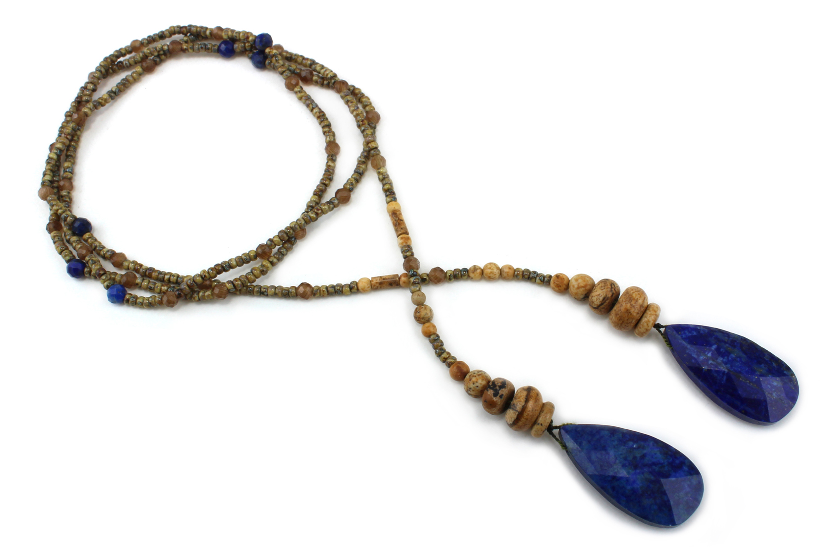 Ce collier vintage en perles naturelles de Lapis lazuli et Jaspe est une pièce unique inspirée par la nature sauvage et aride où la végétation dépouillée laisse place à la puissance du bleu d’un lac.