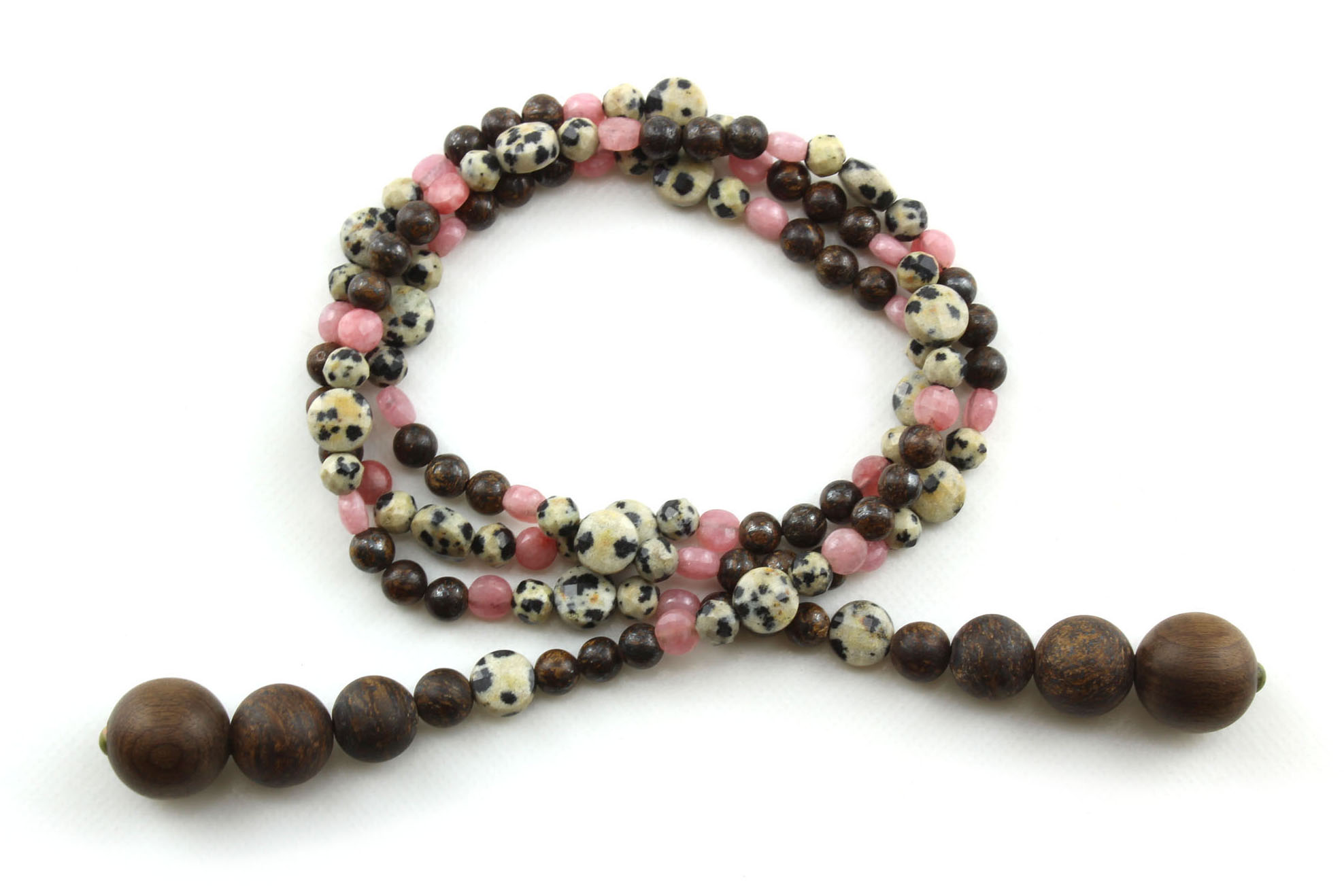 La profondeur brune de la Bronzite évoque l’écorce des vieux chênes, le Jaspe dalmatien, parsemé de taches noires, rappelle la peau mouchetée des champignons cachés sous les fougères, et la douceur rosée de la Rhodonite apporte une touche de lumière, comme une baie sauvage au creux de la main.