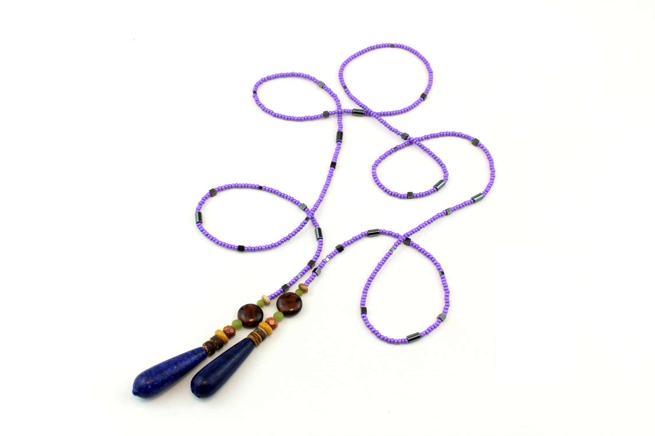 Un Sautoir en perles naturelles de Lapis-lazuli bohème qui évoque la puissance des anciens mystères célestes et l’élégance des civilisations passées. Ce collier écharpe long, d’un violet profond illuminé par les éclats d’hématite et de pierre du Soleil, s’inspire des parures nobles et spirituelles des grandes cultures antiques.