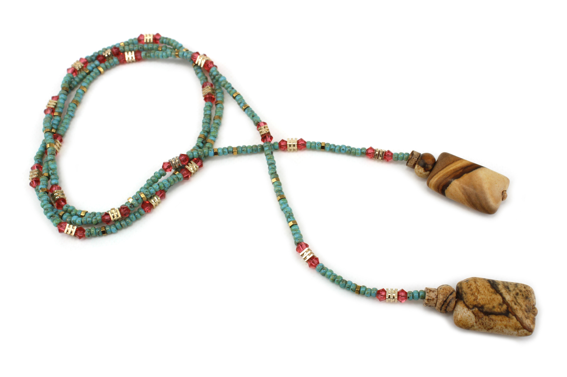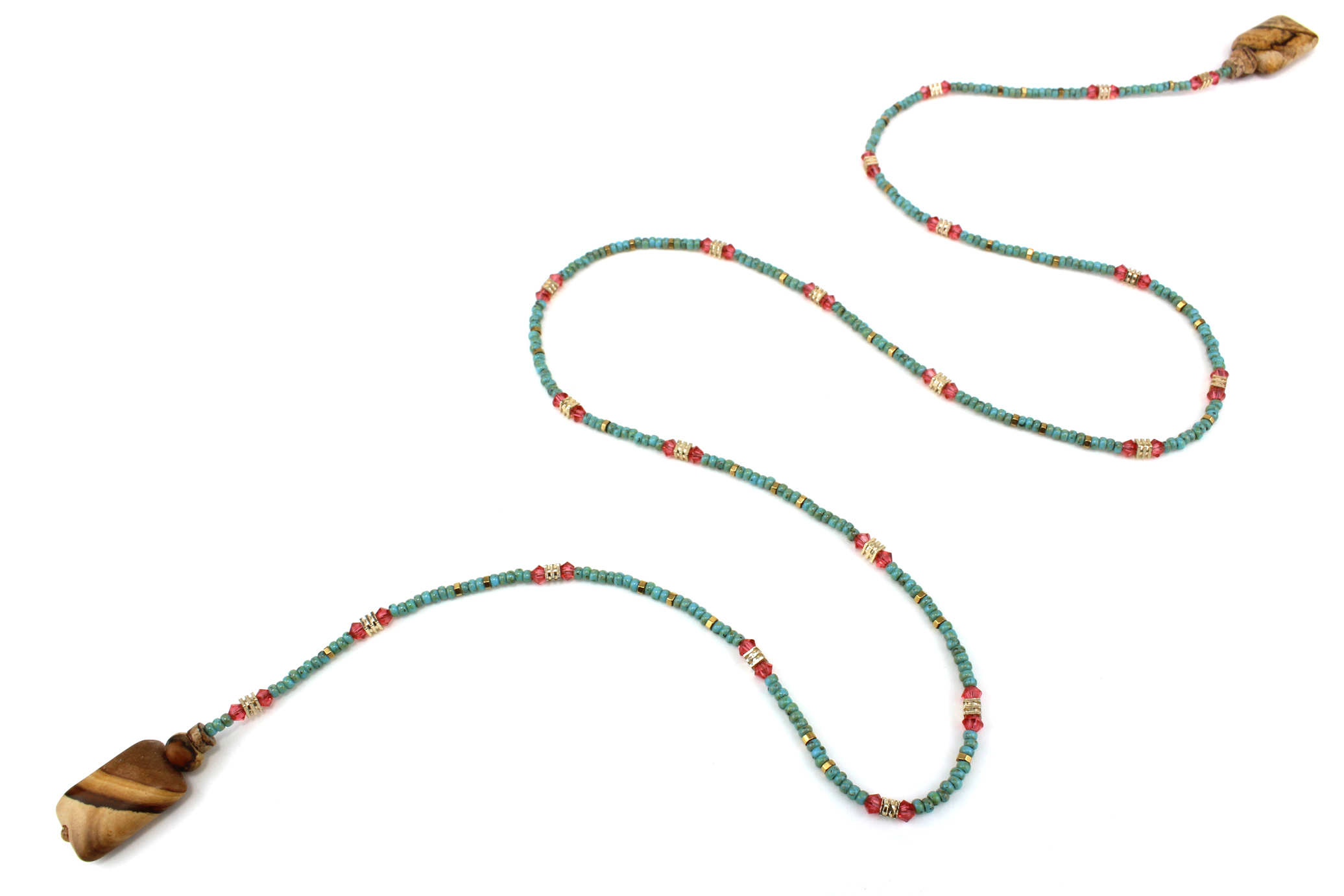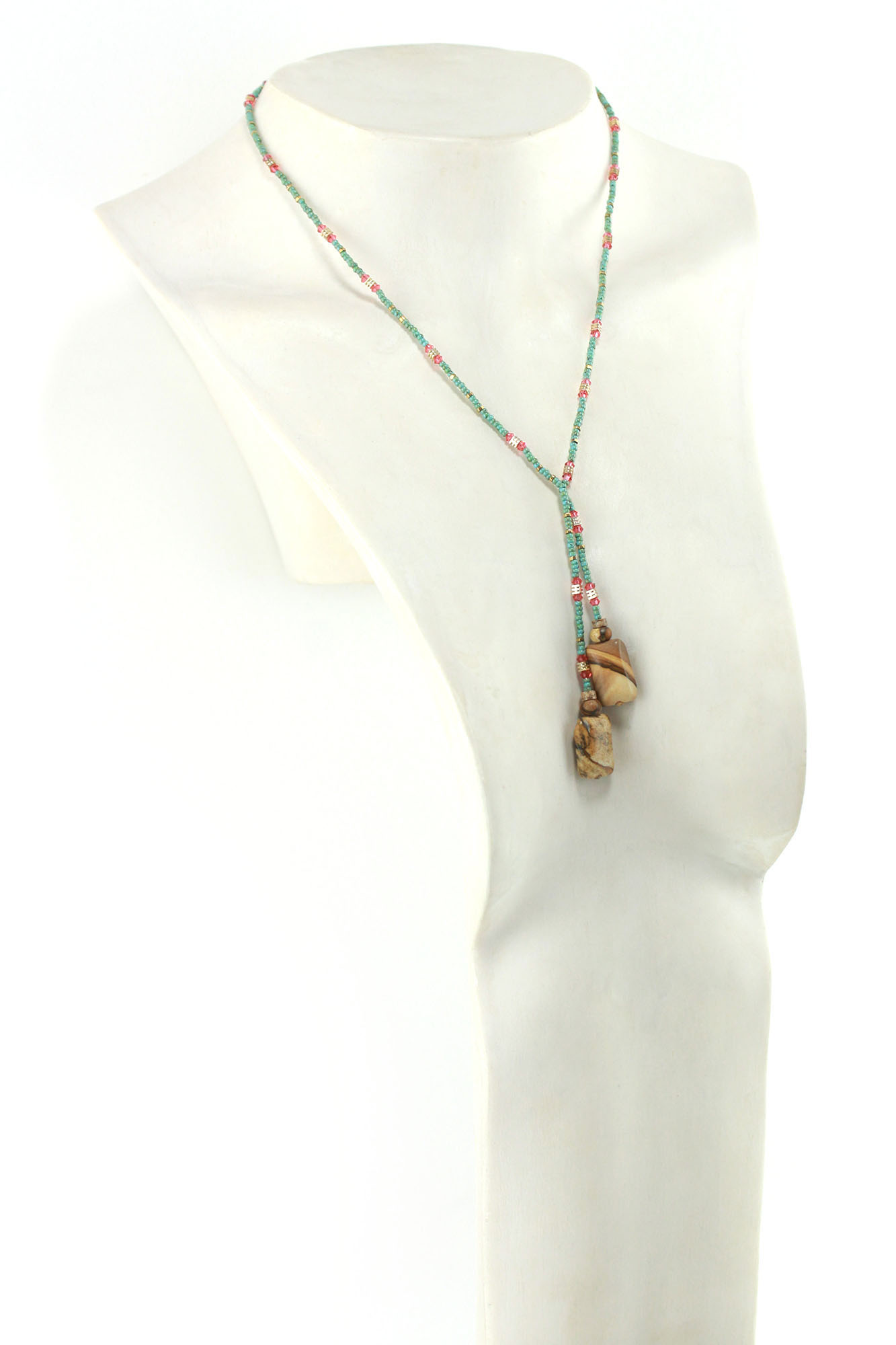 Lariat en perles de Jaspe – Un sautoir vert et rose orangé aux nuances vibrantes